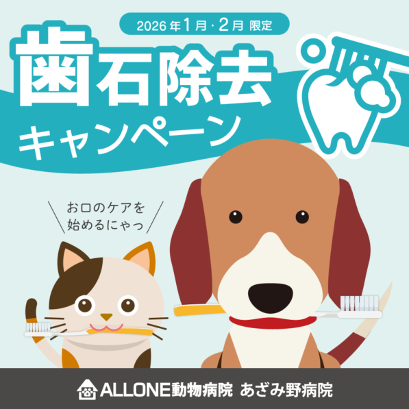 掲載日:2025.11.28 ★ 「歯石除去キャンペーン」のお知らせ(2026年1月~)【あざみ野】 2026年1月から、ALLONE動物病院 あざみ野病院にて「歯石除去キャンペーン」を実施します。 食事に遊び、さまざまな場面でお口を使うわんちゃん・ねこちゃん。定期的なケアで健やかな毎日を送れるようにサポートしましょう。 実施期間: 2026年1月~2月28日(土)まで ※予約制となりますので、お電話ください。 ※実施期間の後半は混み合いますので、お早めにお申し込みください。 詳しくはスタッフまでお問い合わせください。